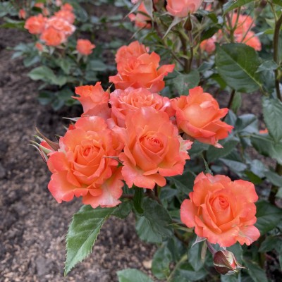 Бутон оранжевого оттенка имеет форму изящного бокала, размер цветков достигает 5 см. Распустившиеся соцветие держится до 14 дней. Небольшие бутончики собраны в зонтиковидные соцветия, образующие пышные «шапки» в центре розового куста. Растение цветет весь сезон, отлично зимует в открытом грунте и не требует особого ухода, отличается хорошей устойчивостью к заболеваниям.