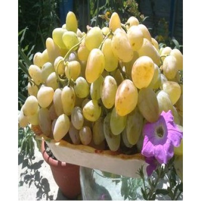 Плоды идеальные, форма - яйцевидная, вес одной ягоды 16-19 гр. Оттенок желто-янтарный, на солнечном свете на ягодах появляется красный оттенок. Вкусовые качества - насыщенно сладкий, похож на сорт Аркадия. В период полного созревания имеет послевкусие муската. Кожура средней плотности, не очень толстая, она не трескается и выдерживает напор ос. Косточек мало: примерно 1-2.